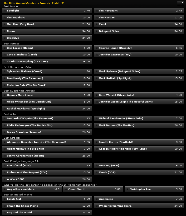 Интересно е што The Hateful Eight веројатно дефинитивно отпаѓа од трка заради доцните скрининзи. Исто е и со Joy на Дејвид О. Расел и The Danish Girl на Том Хупер. На нивна сметка се пробија Straight Outta Compton, The Big Short и Mad Max: Fury Road. Овој последниов, како фаворит од сенка, ништо чудно на крај и Оскарот на Spotlight да му го земе.