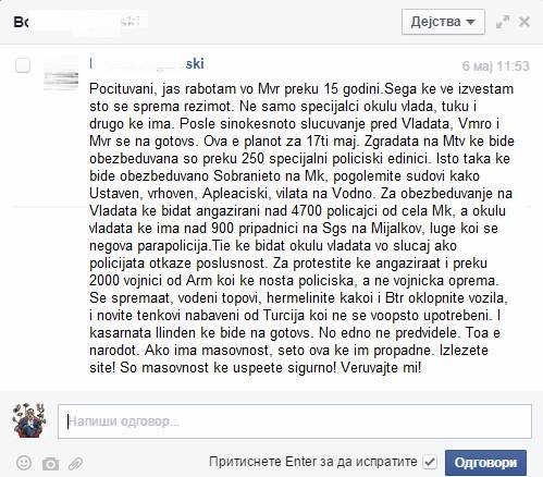 Јас ти кажав уште при првото мислење од кога прв пат ме цитираше дека не стојам зад ова и не го бранам затоа што не сум член на партија ни па ме интересира политика и исто така ти кажав дека сликата ја ставив зошто се поклопуваа случувањата и со напишаното на текстот. Ниту сум за дека е вистинска порака ниту сум за дека е лажна и лажирана... Џит кун до принцип стил без стил мислам дека треба да ме разбираш... Пошто е твој принцип. А иначе лично мое мислење е дека ако дојде до хаос од типот граѓанска војна за рушење на власта верувам дека власта преку МВР нема ама буквално никој да штеди од вработените за да се одбрани и преживее додека да избега без разлика единици не единици обучени не обучени.Од набројаниве се само волци ебр и тигри специјални.Ама ниту тигри ниту волците немаат обука за јавен ред и мир.Премногу безмислено е да се пуштат такви единици на обичен народ,кој нема оружје во рака.