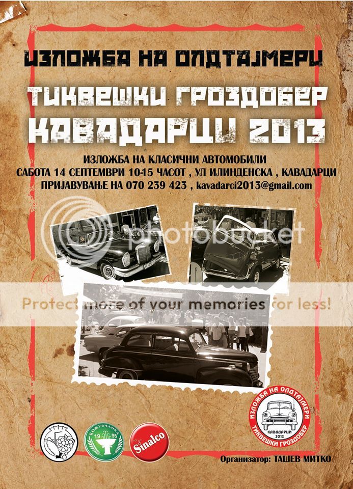 За таа цел, Ве поканувам на втората по ред годишна Изложба на олдтајмери - „Тиквешки Гроздобер Кавадарци 2013“ која ќе се одржи на улица Илинденска во центарот на Кавадарци на 14.09.2013. Заедно ќе ги разгледаме сите возила, и заедно ќе ги избериме најдобрите на изложбата!