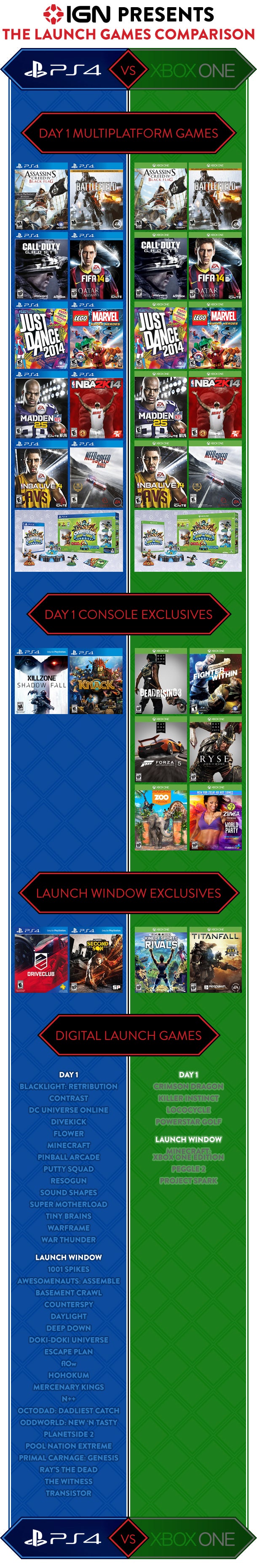 First up: the games! How many next-gen games are available day one? Which system has more launch window exclusives? Which console has the right games for me? The video and infrographic below each have everything you need to know about the PlayStation 4 and Xbox One's budding game libraries.